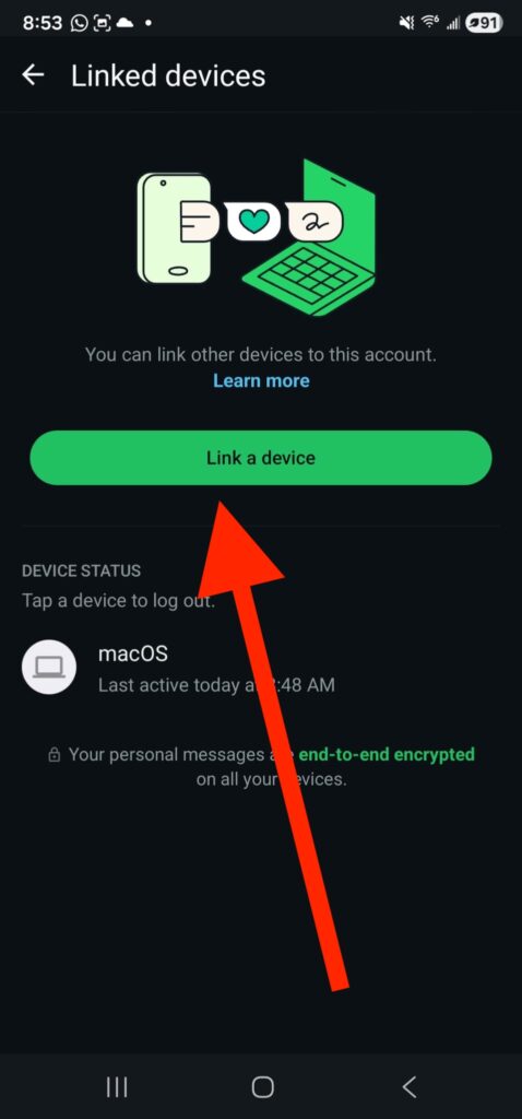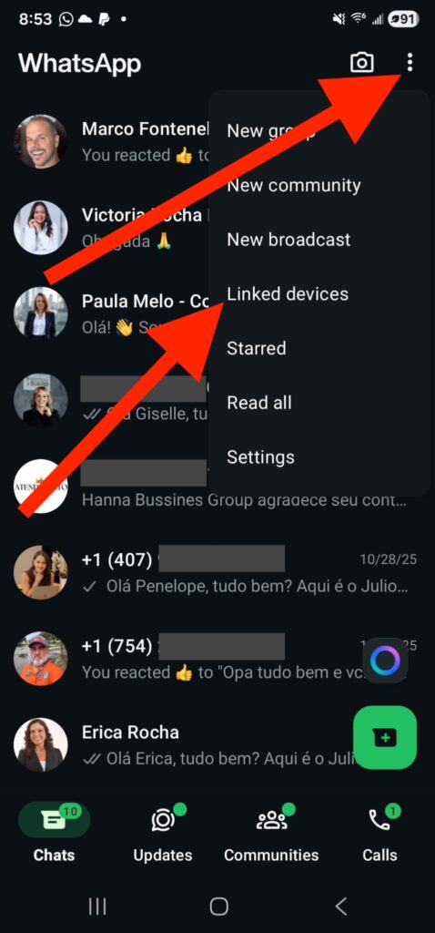 1 – Access the menu using the 3 dots in your WhatsApp app and select Linked Devices:
