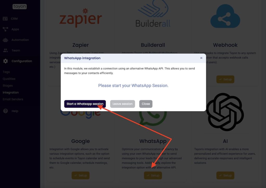 3 – Click on the Setup button below the WhatsApp logo and on Start a WhatsApp session: